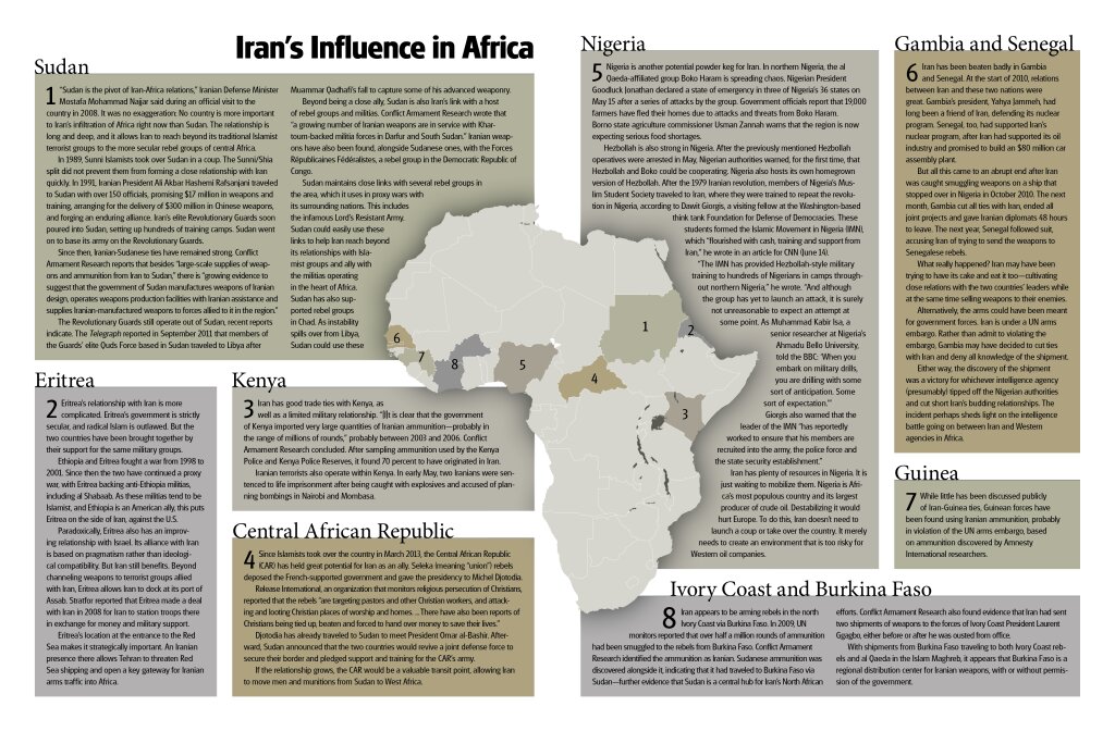 Other observers point to Iran’s efforts to woo African governments. In a paper titled “Africa: Iran’s Final Frontier?” Michael Rubin, resident scholar at the American Enterprise Institute for Public Policy Research, wrote, “Tehran sees many of Africa’s 54 countries as easy picking” (April 17).