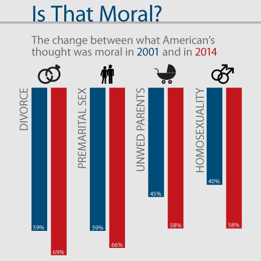 These survey results reveal the true state of America’s moral health. It is not on the rebound—it is in serious decline. Gallup’s results show a significant shift in acceptance of divorce (10 points), sex outside of marriage (7 points), having children outside of marriage (13 points) and homosexual relations (18 points). The majority of Americans view divorce, sex outside of marriage, having children outside of marriage and homosexual relations as morally acceptable. This is terrifying!
