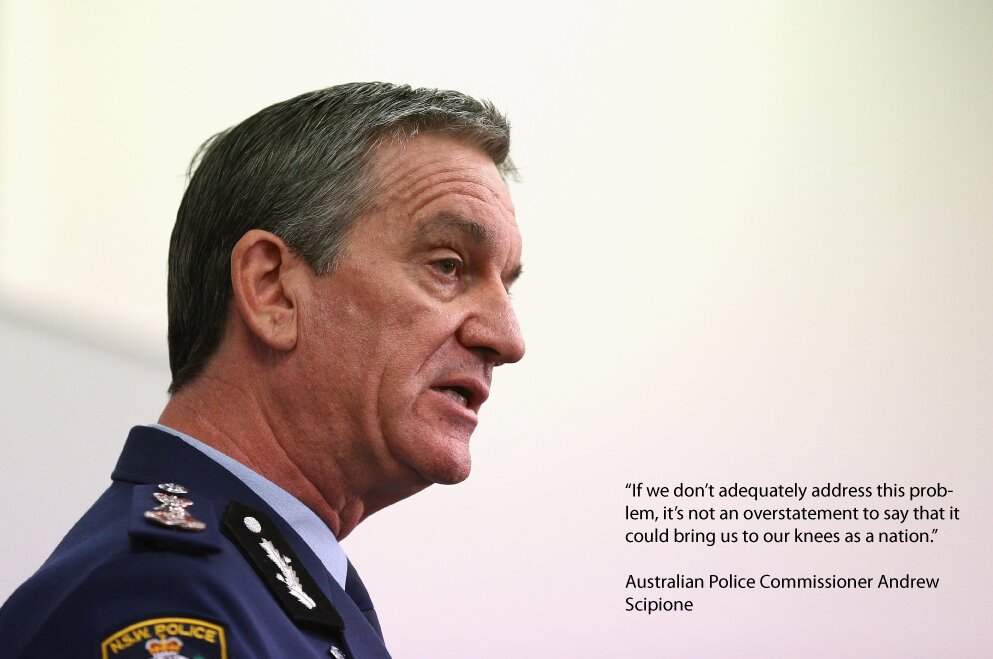 Ice is now considered “the most dangerous and highest risk to our nation” according to Australian Crime Commission Chief Executive Chris Dawson. But not only because it funds the gangs. As Minister for Justice Michael Keenan said, “Our nation’s addiction to this mind-eating, personality-distorting, life-ending drug” is crippling the social fabric of communities. “In recent years, we’ve seen the creep of ice use stretch across the nation, with individuals from all levels of society succumbing to its depravity,” Keenan added.
