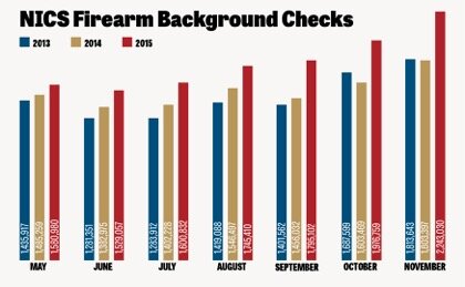 A record number of firearm-related background checks were processed in November, making it the seventh consecutive monthly record. The Federal Bureau of Investigation processed 2,243,030 firearm background checks during the month—an astonishing 236,111 more than the previous record set in 2012. If trends hold for December, 2015 will become a record year for gun sales. Second Amendment advocates note that sales surge after violent attacks take place and when political rhetoric about restricting guns escalates.