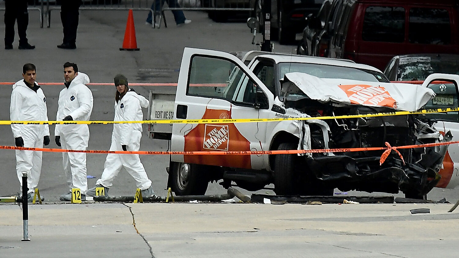 Investigators work around the wreckage of a pickup truck a day after it was used in a terror attack in New York on November 1, 2017. The driver plowed down a New York cycle path, killing eight people, in the city’s worst attack since 9/11.