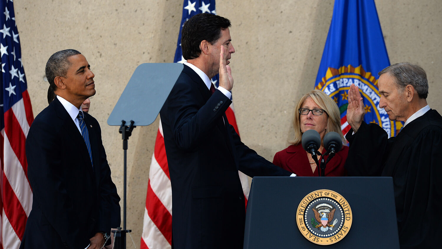 U.S. President Barack Obama looks on as Judge John Walker swears in new FBI director James Comey at the FBI headquarters in Washington on Oct. 28, 2013.