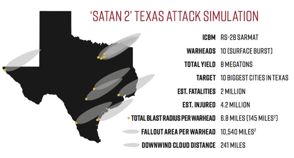For several years now, Russia has been updating its missiles. And President Vladimir Putin recently announced several new weapons. Russia’s new RS-28 Sarmat (popularly called the “Satan 2”) is the largest superheavy intercontinental ballistic missile in history. Each missile can carry 10 large nuclear warheads or 16 smaller ones, enough destructive power to practically destroy an entire European nation or an American state as large as Texas.