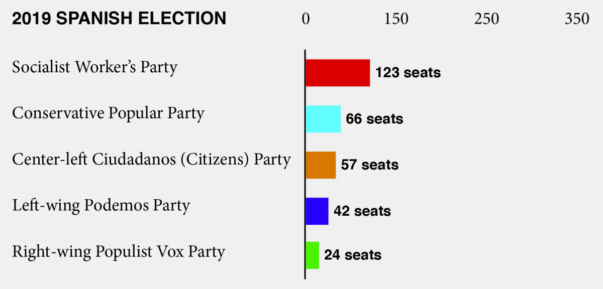 Prime Minister Pedro Sanchez’s Socialist Workers’ Party still has the highest number of seats in parliament, with 123 of 350. The conservative Popular Party has the second highest with 66 seats. The center-left Ciudadanos (Citizens) party won 57 seats; left-wing Podemos, 42 seats; right-wing populist Vox, 24 seats.