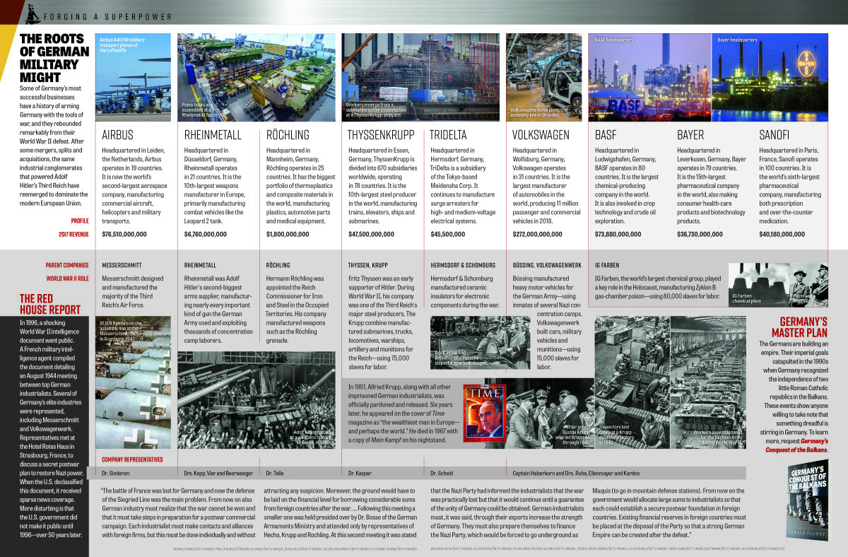 In fact, just about all the companies represented at that secret meeting are now back at it, manufacturing weapons. Rheinmetall is a huge armaments manufacturer. The company merged with the German truck manufacturer man to create one of Europe’s largest defense firms. Büssing, another company at the 1944 meeting, is also part of the conglomerate, having merged with man in 1971. Earlier this year, the Rheinmetall-man consortium bought a 55 percent stake in Britain’s bae Systems military vehicle production. Messerschmitt, one of the more famous attendees of the 1944 meeting, returned to aircraft manufacturing under the name Airbus. After several mergers and takeovers, it became a core part of European Aeronautic Defense and Space Co.—Europe’s top manufacturer of military helicopters and fighter jets.