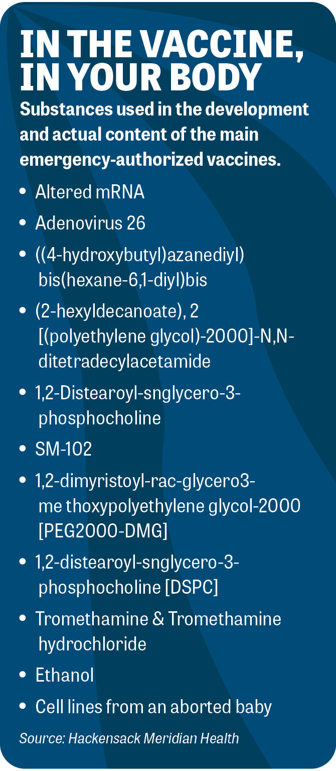 The Pfizer and the Moderna versions of the covid-19 vaccine contain polyethylene glycol—a petrochemical known to cause skin rashes, nausea, vomiting, difficulty breathing and shock. And the AstraZeneca version was developed using kidney cells from a baby aborted in 1973 and a cold-causing virus isolated from the stool of a chimpanzee. If you added the eye of newt and toe of frog, Dr. Madej’s comparison to a “witches’ brew” might become literal. Yet millions are injecting themselves with this cocktail of chemicals and experimental molecules in hopes that it will protect them. In some few cases, this brew ultimately kills them!