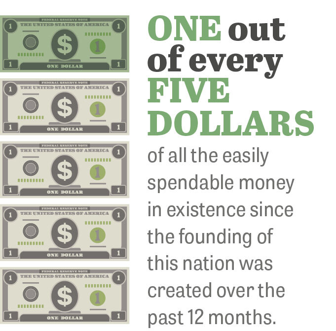 In other words, one out of every five dollars of all the easily spendable money in existence since the founding of this nation was created over the past 12 months. And the Federal Reserve has used much of that money to buy trillions of dollars of government bonds, treasuries and even people’s mortgages.