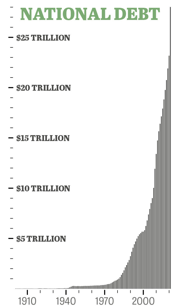 Even during the best years of the last two presidential administrations, not once did the government run a budget surplus. It took in record amounts of revenue through taxes, yet spent even more. The national debt took more than 200 years to reach $1 trillion. It took only 26 more years to rise to $10 trillion in 2008, and only 12 years to exceed $27 trillion. Our national debt is now greater than the sum of all goods and services all Americans produce in an entire year. Yet our leaders—and many of us—refuse to change our behavior and comply with economic laws of cause and effect.