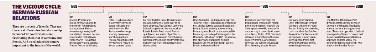 These business and personal links frequently helped Germany and Russia form alliances, which repeatedly dominated and divided Europe between them. Under Catherine the Great, Russia, the German state of Prussia and Austria divided Eastern Europe among themselves—chopping off lumps of Poland until, by 1795, nothing was left. Otto von Bismarck, arguably Germany’s most successful leader, famously quipped, “The secret of politics? Make a good treaty with Russia.”