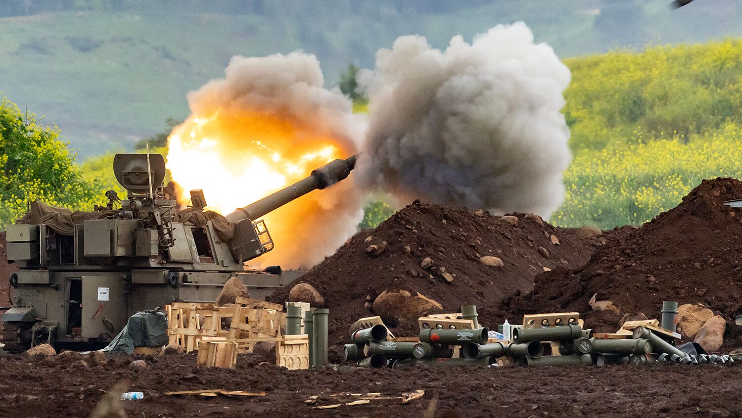 An Israeli howitzer artillery gun fires rounds toward southern Lebanon from the upper Galilee in northern Israel near the border on March 15.