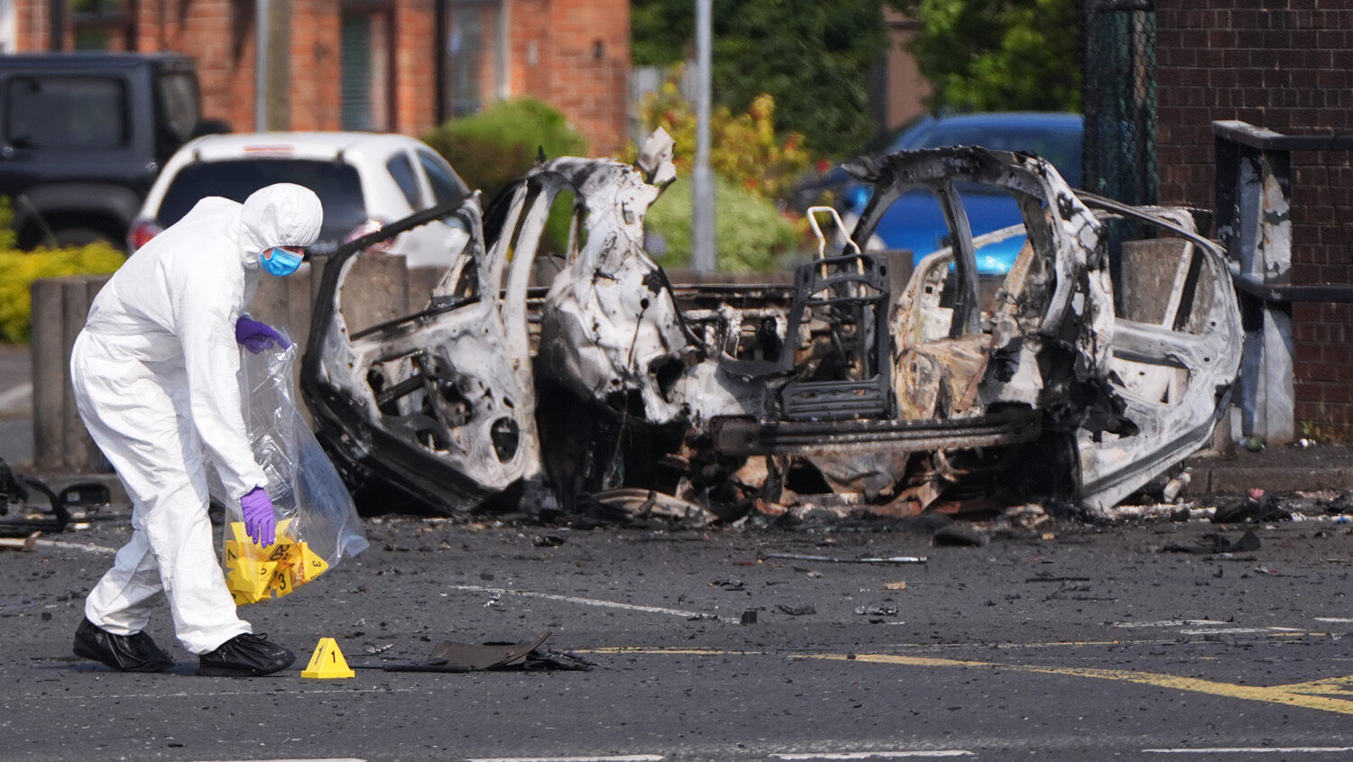 Forensic investigators examine the scene in Dunmurry, Northern Ireland, on April 26 after a car exploded outside a police station.