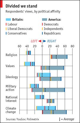 Like most west Europeans, Britons tend to have more left-wing views than Americans …. The gap between Britain and America is widest on religion: even British Conservatives are a great deal more secular than American Democrats are. The two are a bit closer on social values (abortion, homosexuality and so forth), and they overlap on ideology (mainly, how active the state should be), with Britain’s Tories to the right of America’s Democrats.On five of the six groups of issues selected, American opinion is far more polarized than British (only nationalism seems to unite America’s left and right). Gone are the days when it was British politics that embraced political extremes and Americans looked on bemused. The gap between Republicans and Democrats is almost always far greater than that between Tories and (usually) Liberal Democrats.