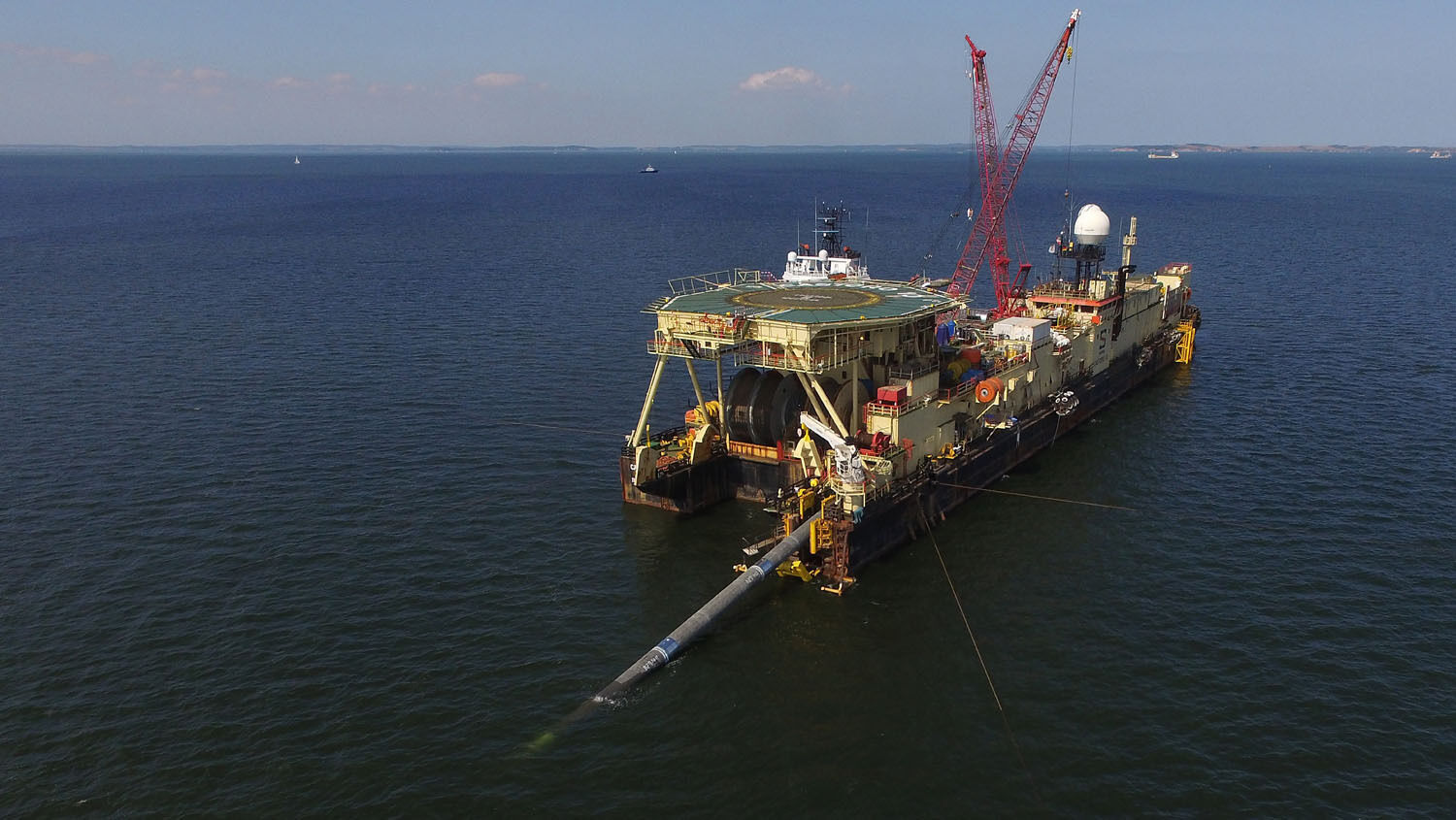 In this aerial view the Castoro 10 pipelay vessel lays concrete-coated pipe for the Nord Stream 2 gas pipeline onto the seabed of the Baltic Sea on August 16, 2018 near Lubmin, Germany.